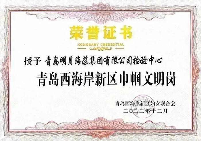 日前,青島明月海藻集團檢驗中心被區婦聯授予“巾幗文明崗”榮譽稱號。